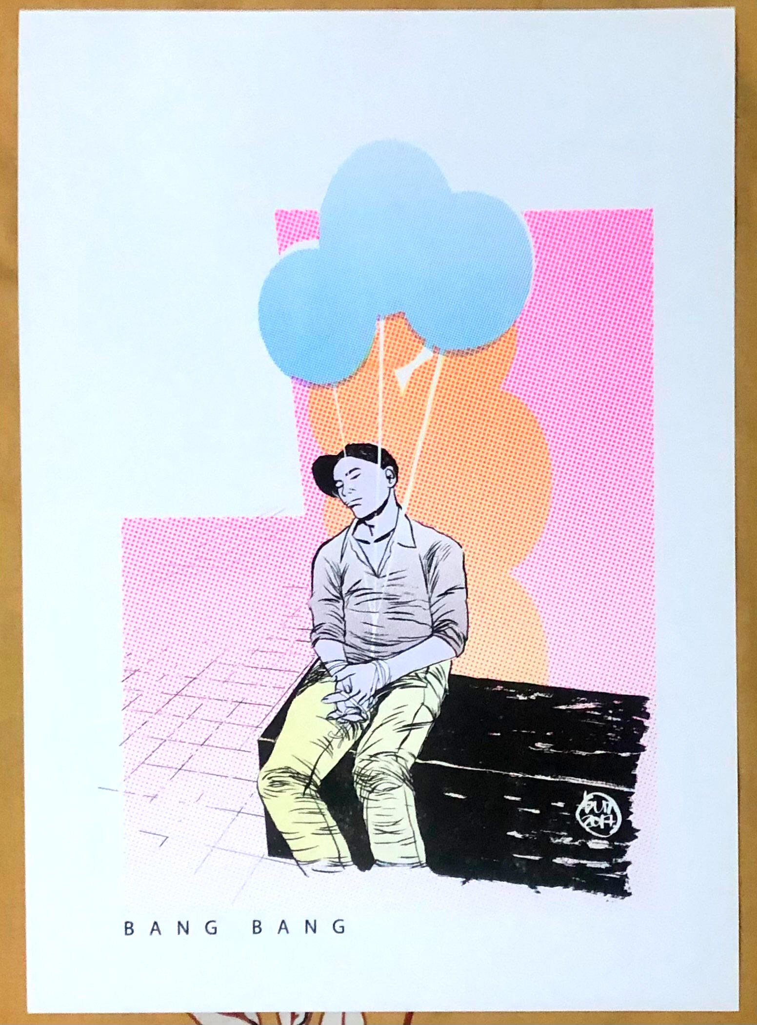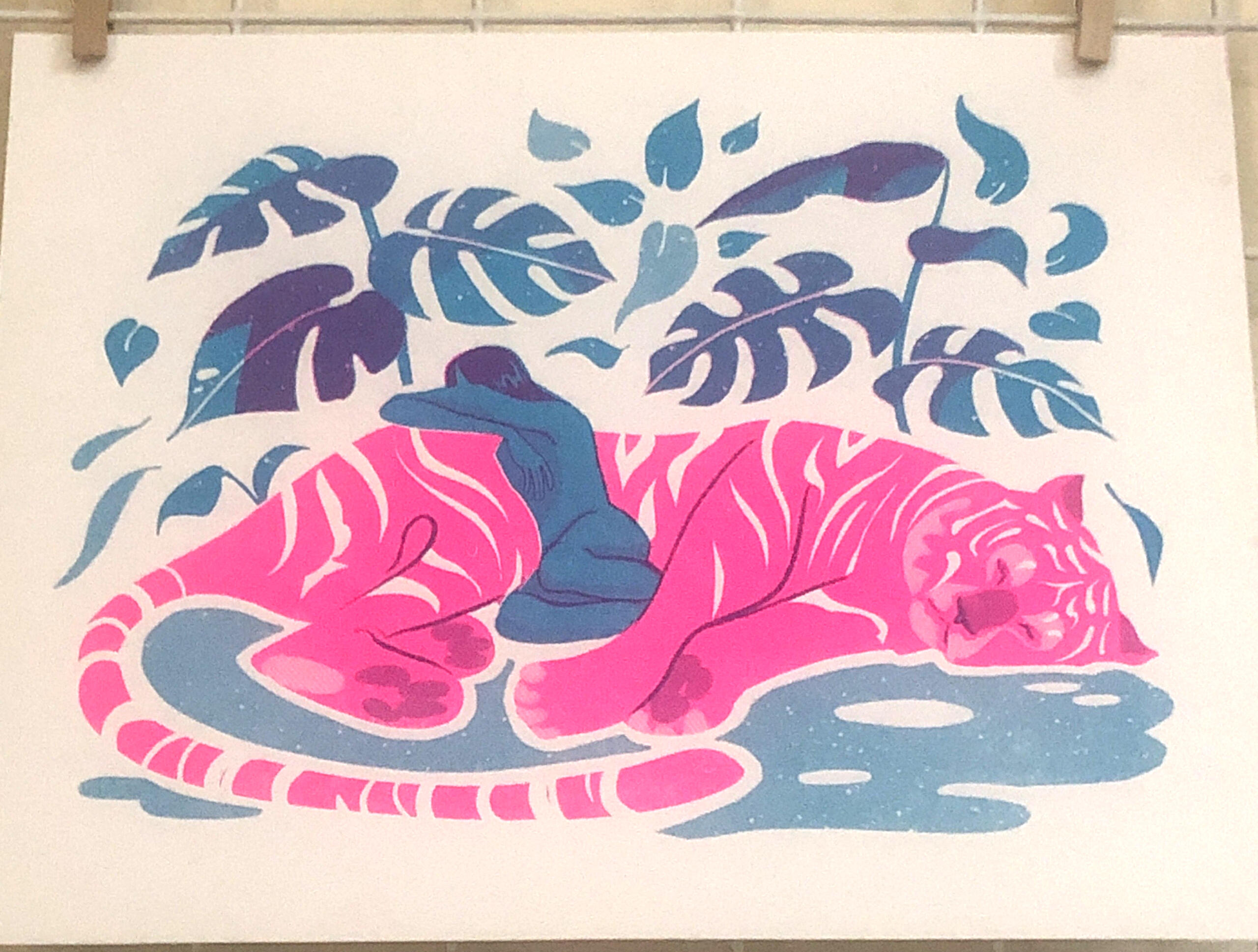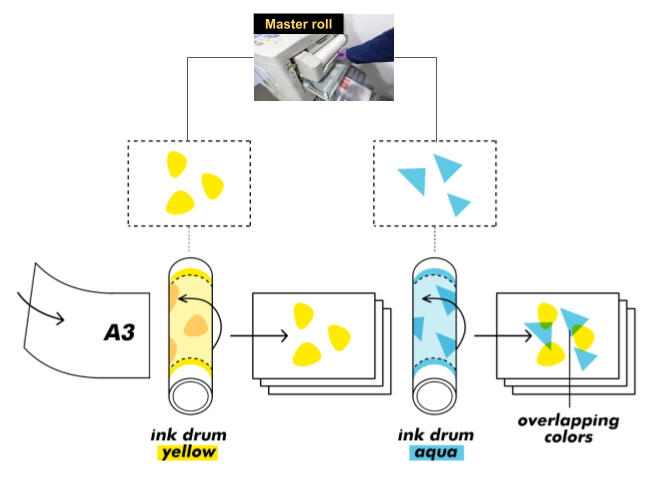 Risograph printing is similar to screen printing. It's a “spot-color” print method that rolls ink on to a paper one ink drum at a time through the stencil of a master.
