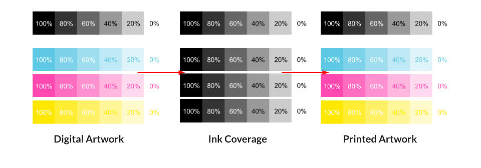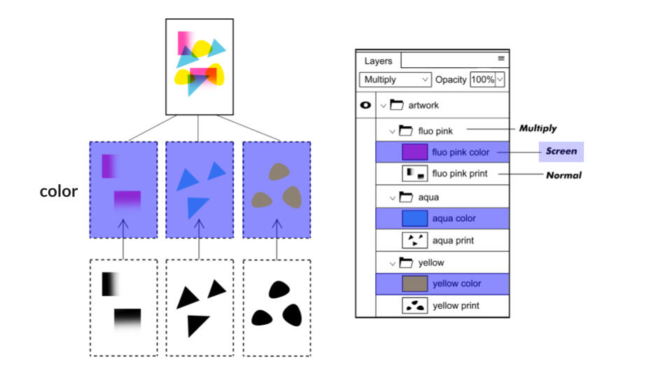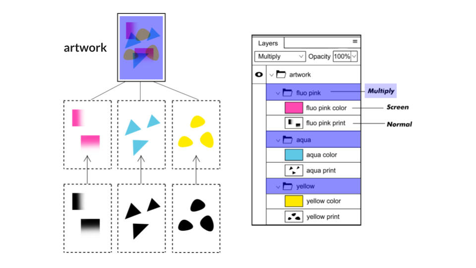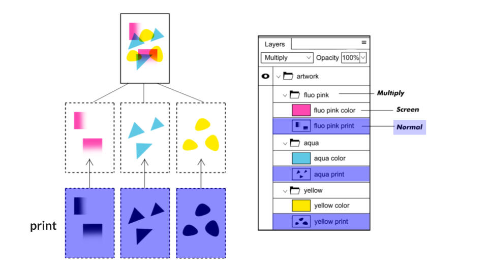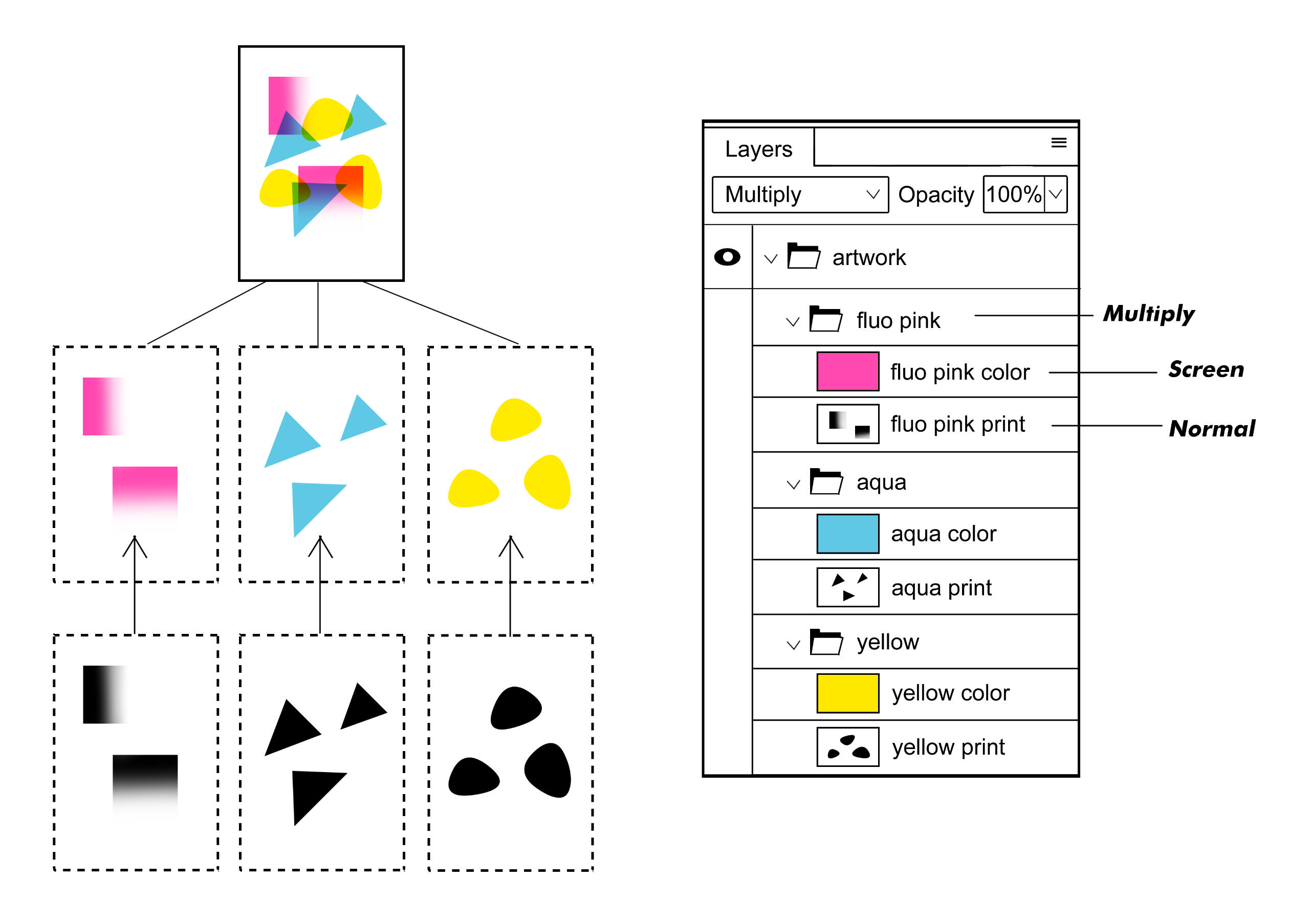 Risograph printers only read grayscale value. This means white (0%) = no ink passes, and black (100%) = all the ink passes, whatever that ink color is.Submit a PSD with layers similar to the image below. These layers are pre-organized in the riso template ↓
