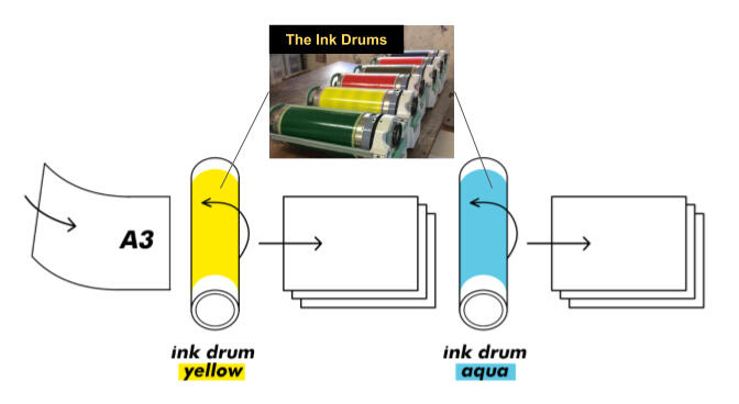 The ink drum is a large cylinder coated with one ink color. Inside the printer, the drum rolls around the paper to impress the ink.