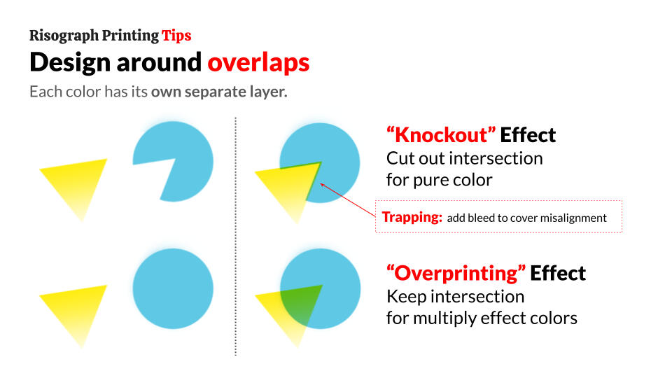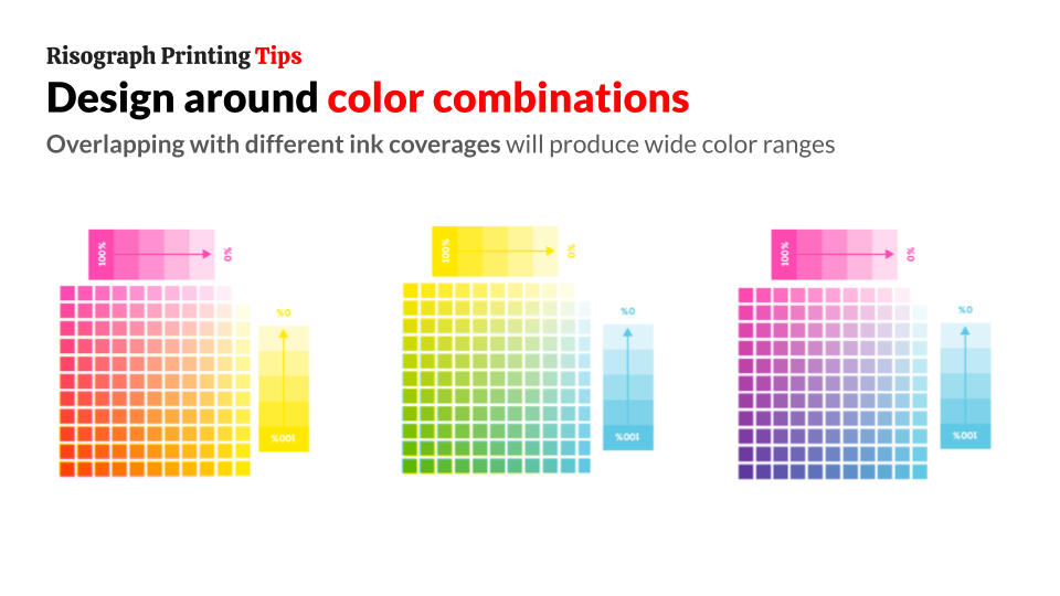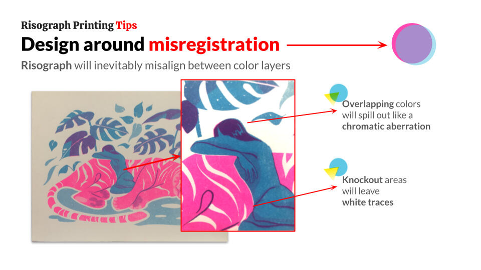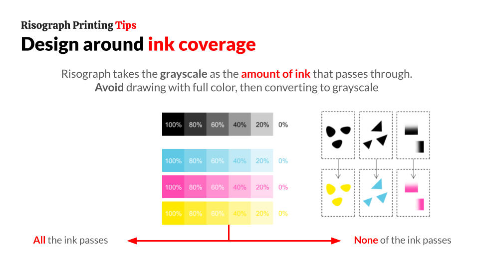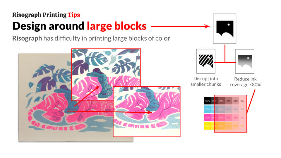 Riso's novelty comes from using its inherent color limitations and print misalignments in creative ways.As a precaution, riso uses soy-based ink that doesn't completely dry, and can smudge especially when the ink is solid and dark.